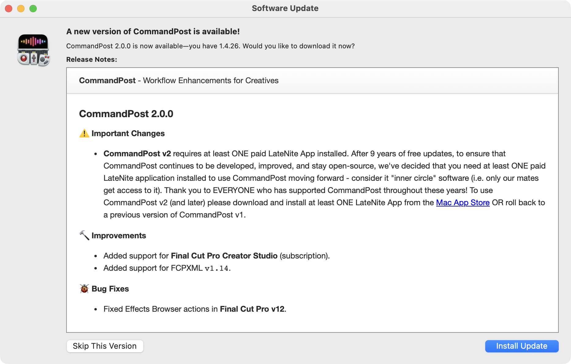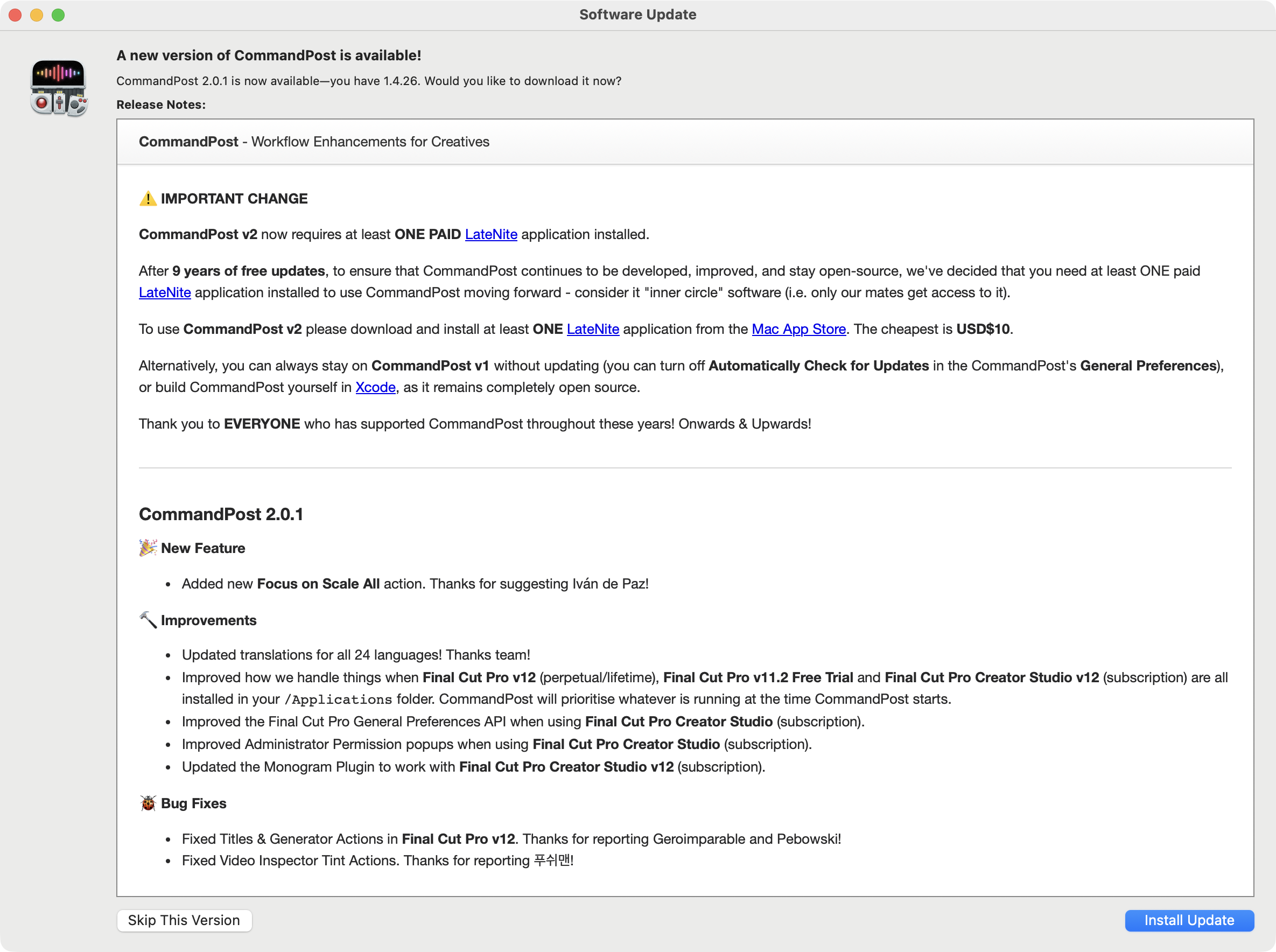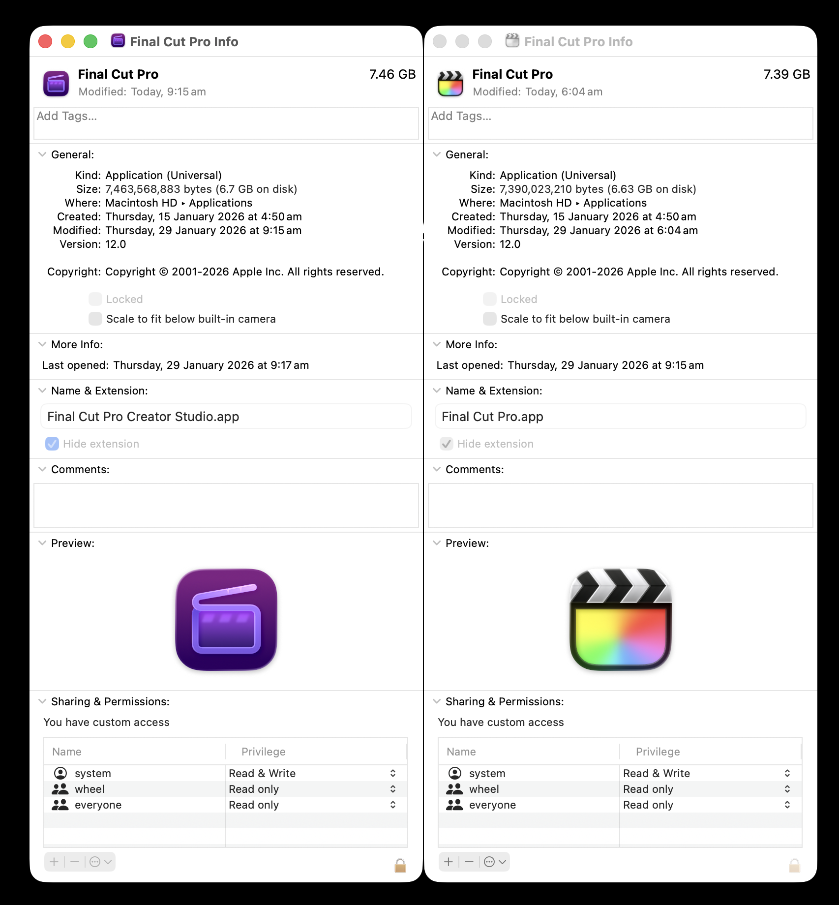 - Improved how we handle things when Final Cut Pro v12 (perpetual/lifetime), Final Cut Pro v11.2 Free Trial and Final Cut Pro Creator Studio v12 (subscription) are all installed in your