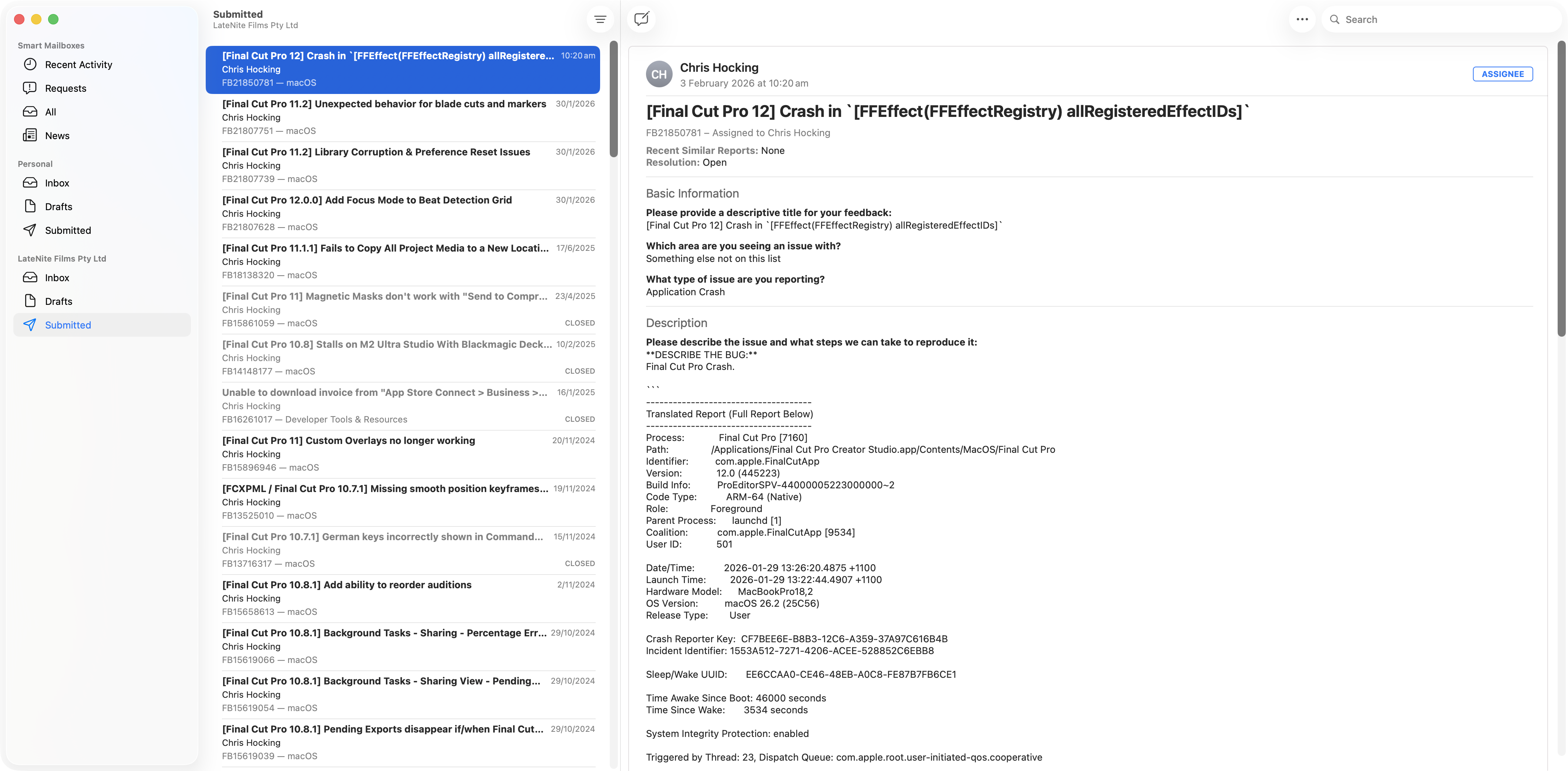 Here's a list of the 30 most recently added Final Cut Pro 12 bug reports: