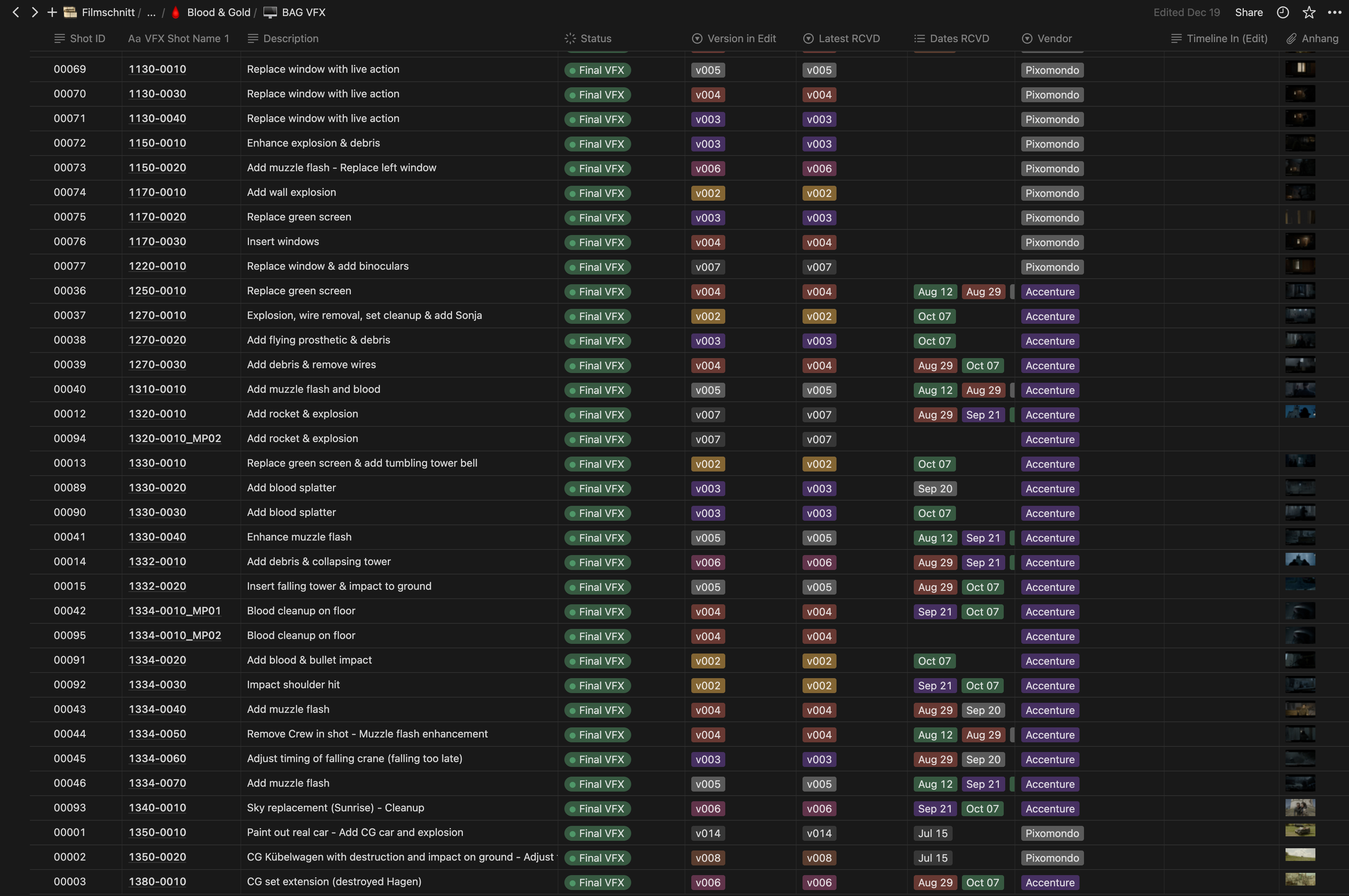 - Notion is our database to keep track of the production status of each scene, VFX shots and other useful information.