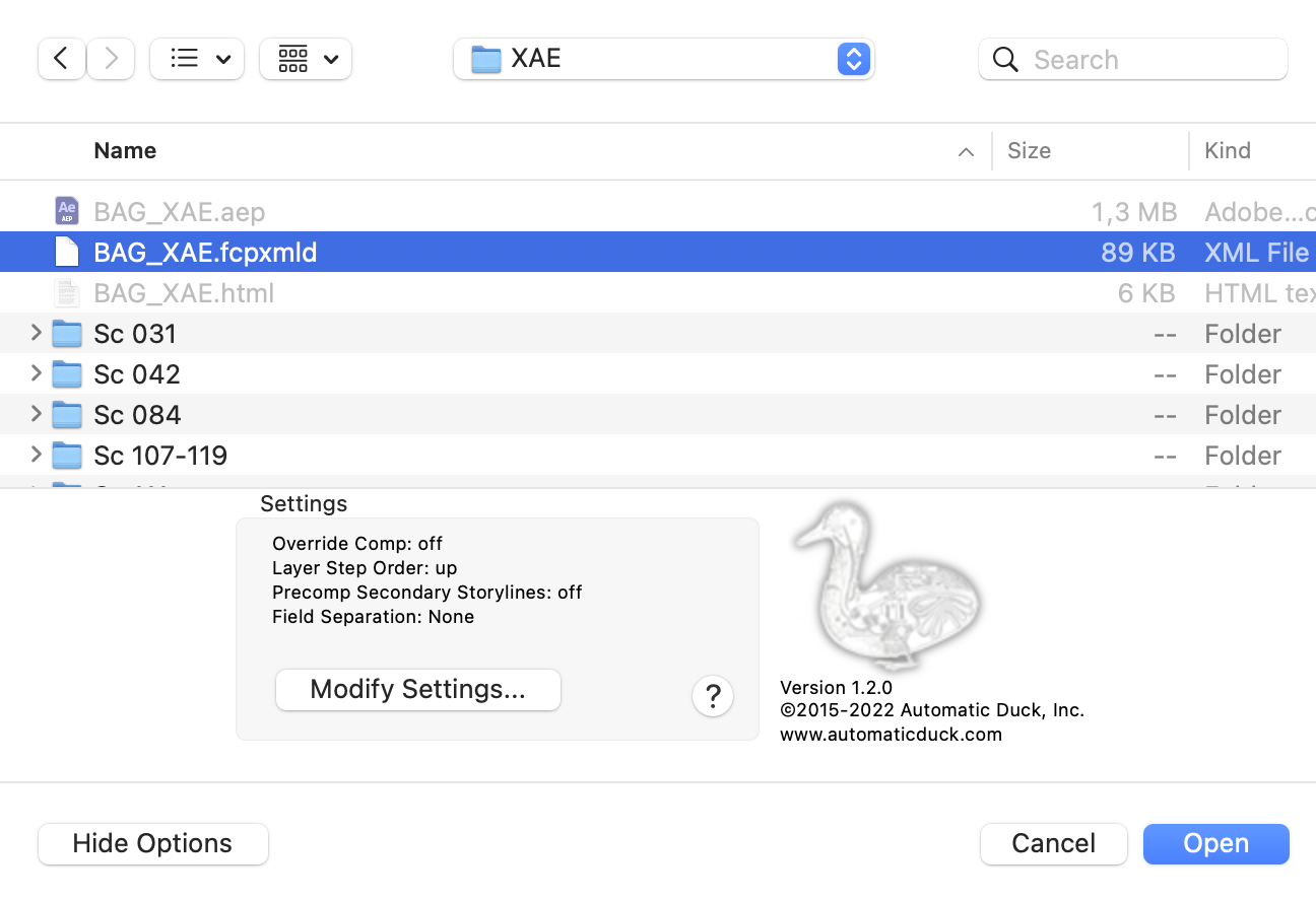 Over in After Effects you select "Import... > Ximport AE..." and start the import process. This only takes a few seconds and all your compound clips will be imported as Compositions right away. You will also find the original media files next to those. There's a few settings in the import dialogue, but I mostly keep them at default. As Ximport AE references the original media files, you can always adjust the length of any clip in your AE Composition. This is super helpful and an added benefit compared to working with exported/rendered clips.