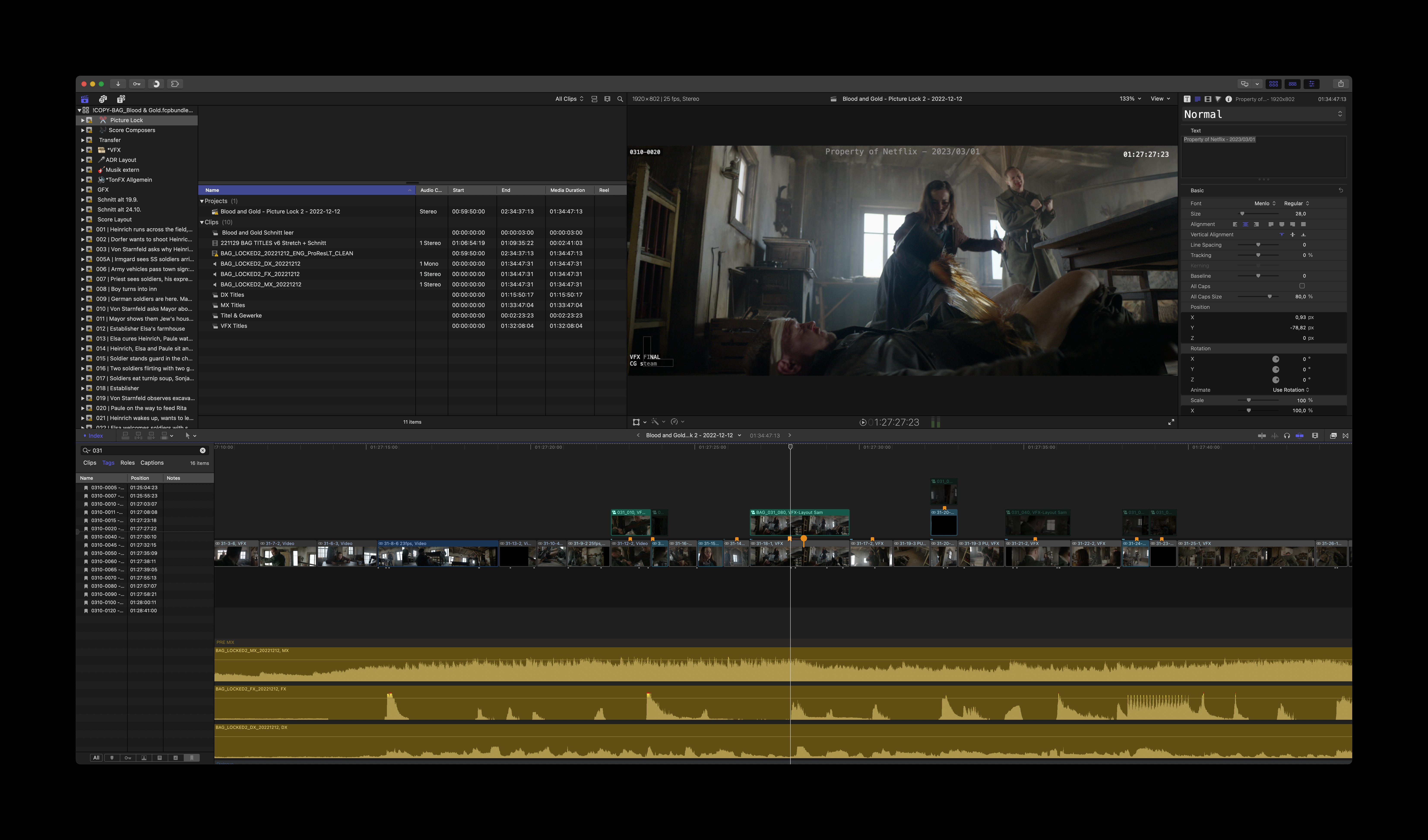 Blood & Gold premiered on Netflix on Friday May 26th 2023. Fully edited in Final Cut Pro. Directed by Peter Thorwarth and edited by Knut Hake. I (Sam Pluemacher) was the Assistant & VFX Editor on this production. If there are any questions please feel free to reach out to me.