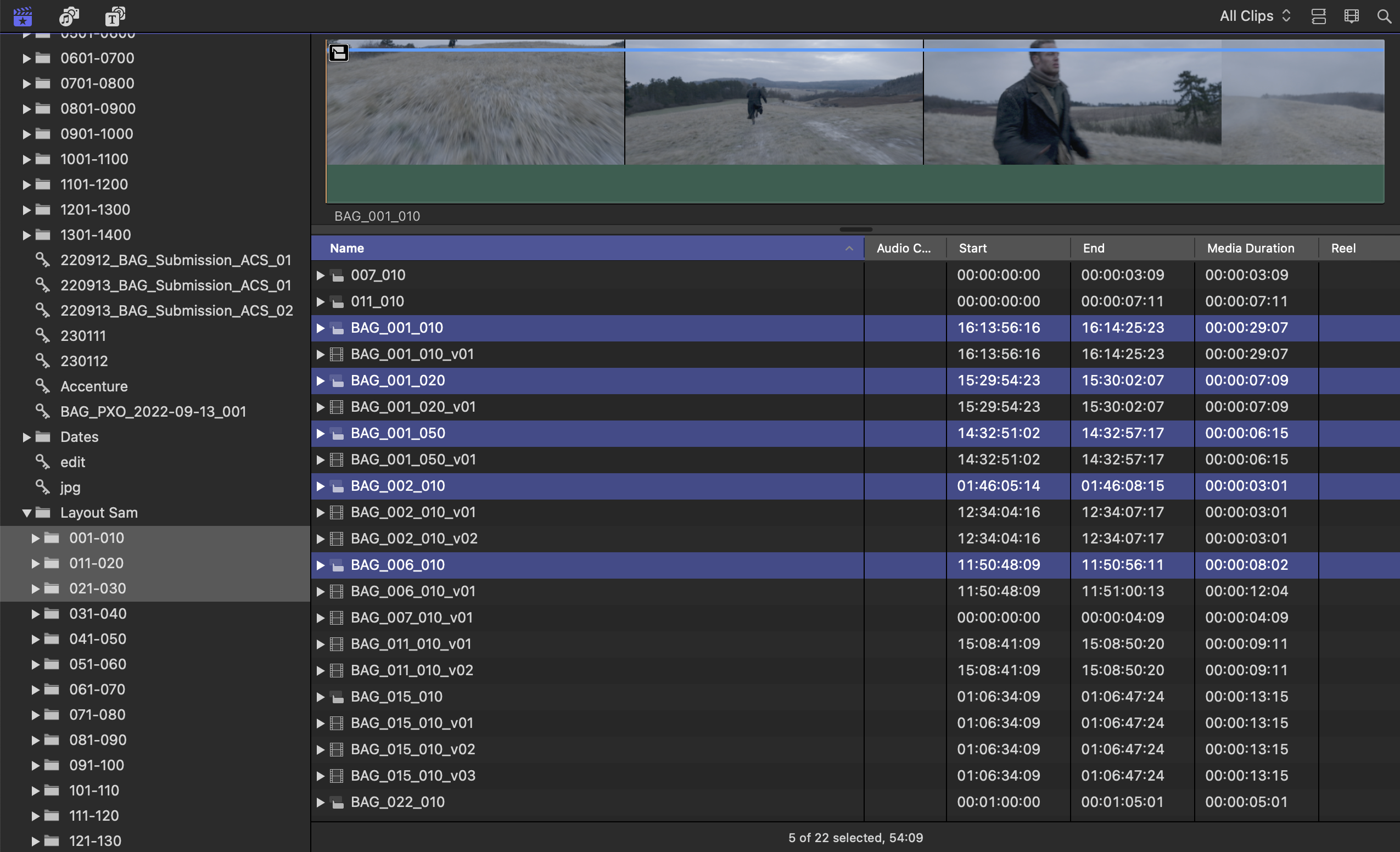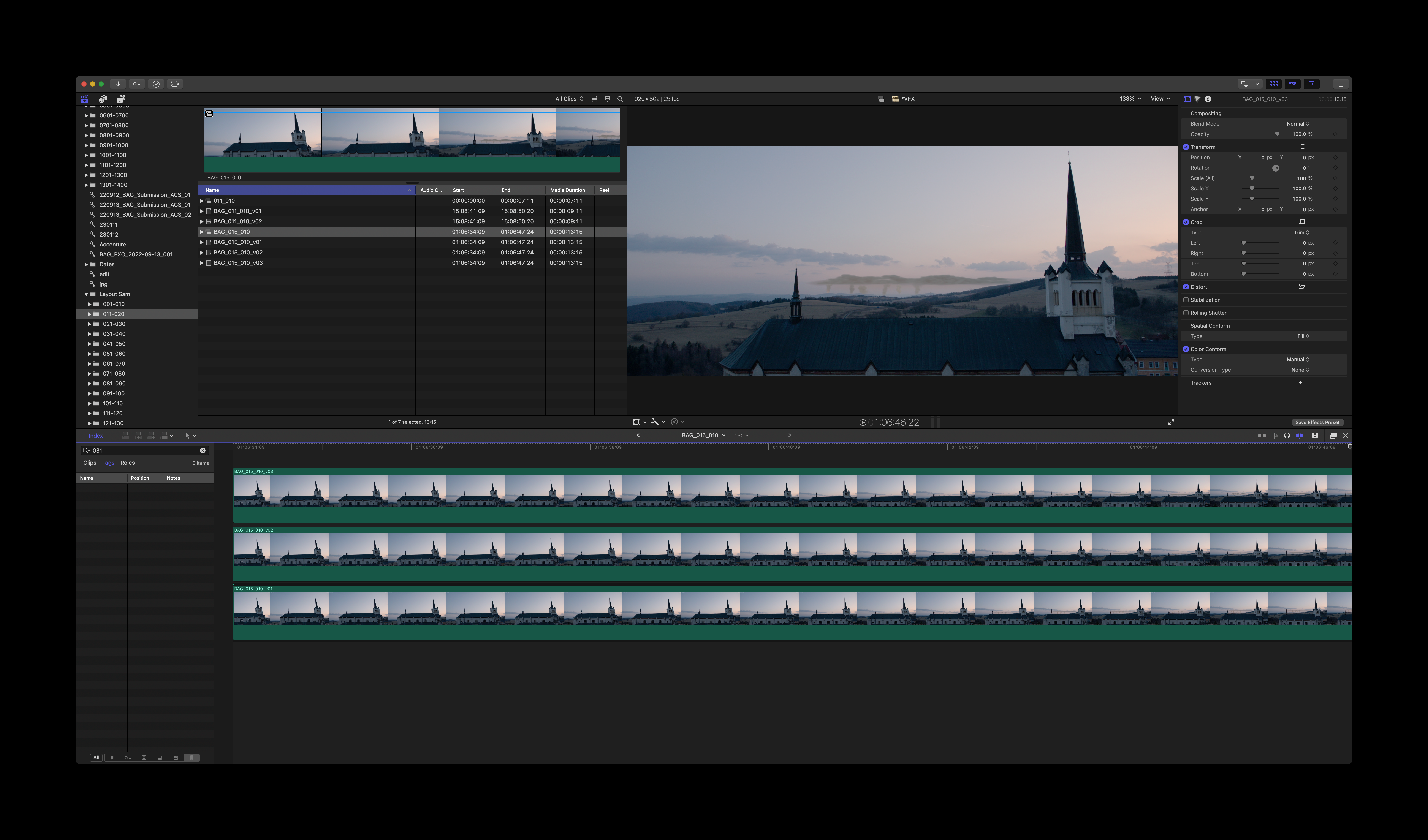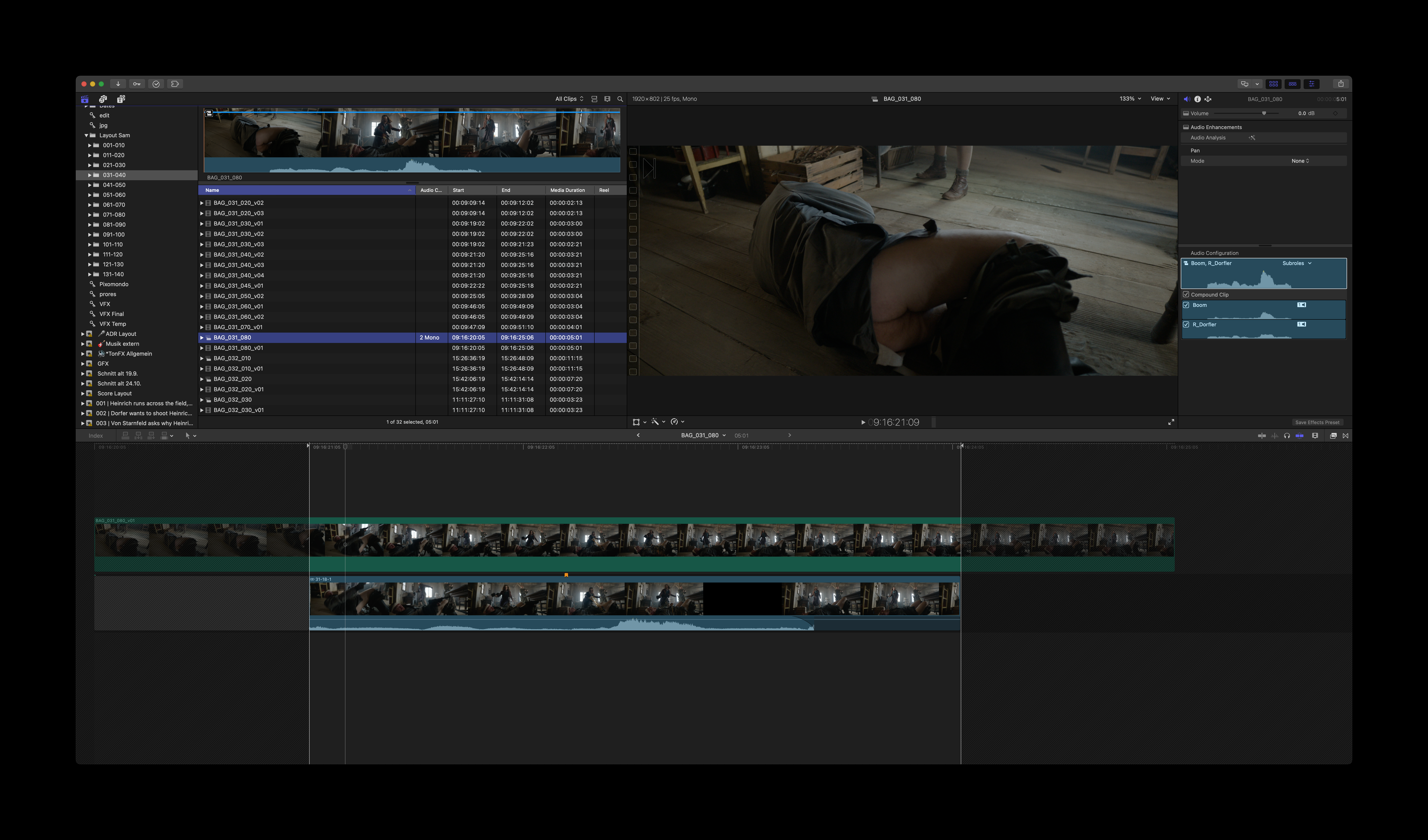 Once a sequence is ready to be worked on, I will create compound clips for our VFX shots and name them accordingly - e.g. "BAG_001-0010". Compound clips are great for VFX shots, because any changes inside the compound clip will automatically be reflected in all instances of that compound clip. I will usually add 24 frames of handles to each VFX shot as it gives Knut some flexibility in the editing process.