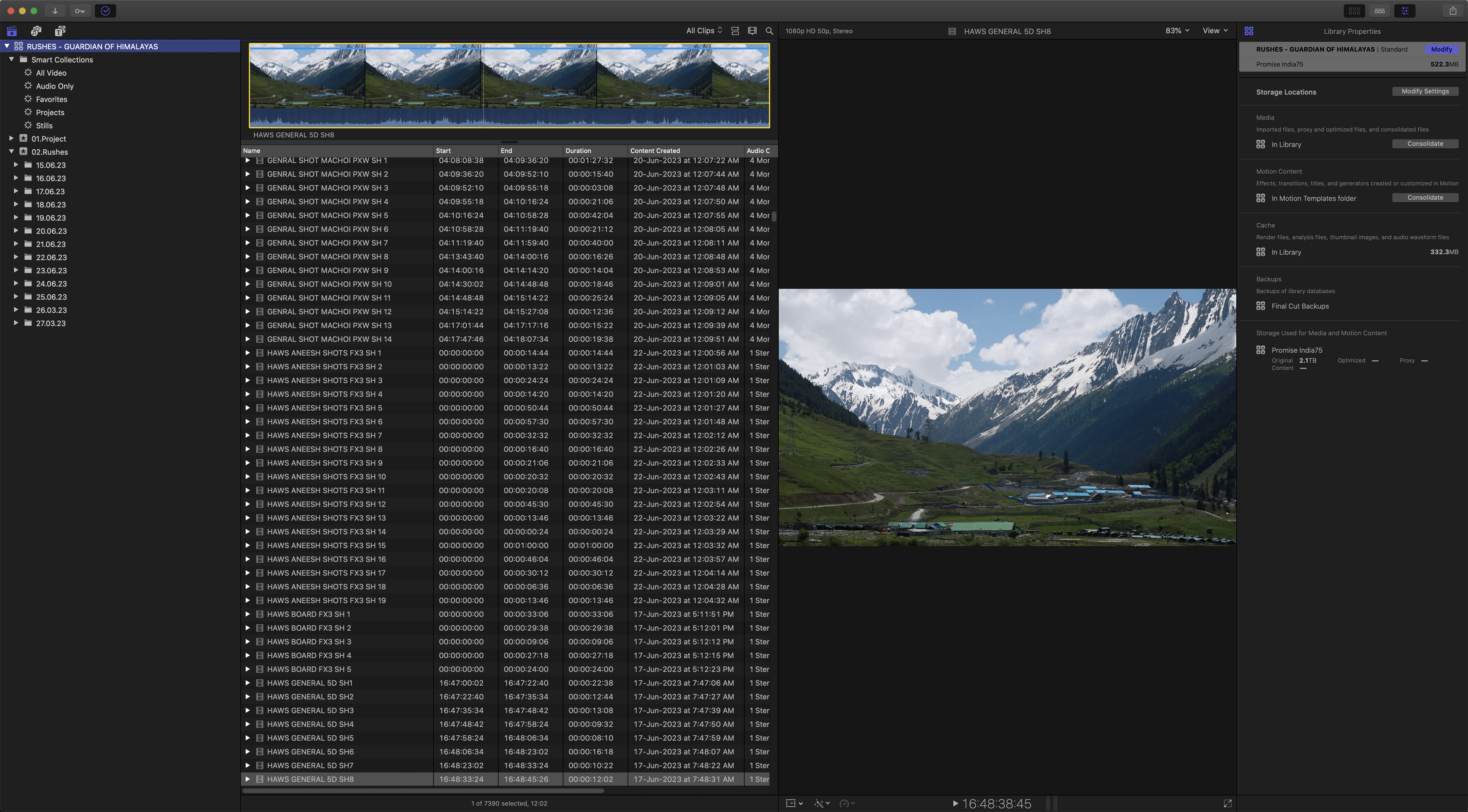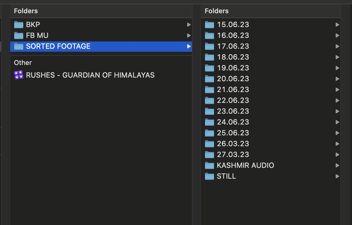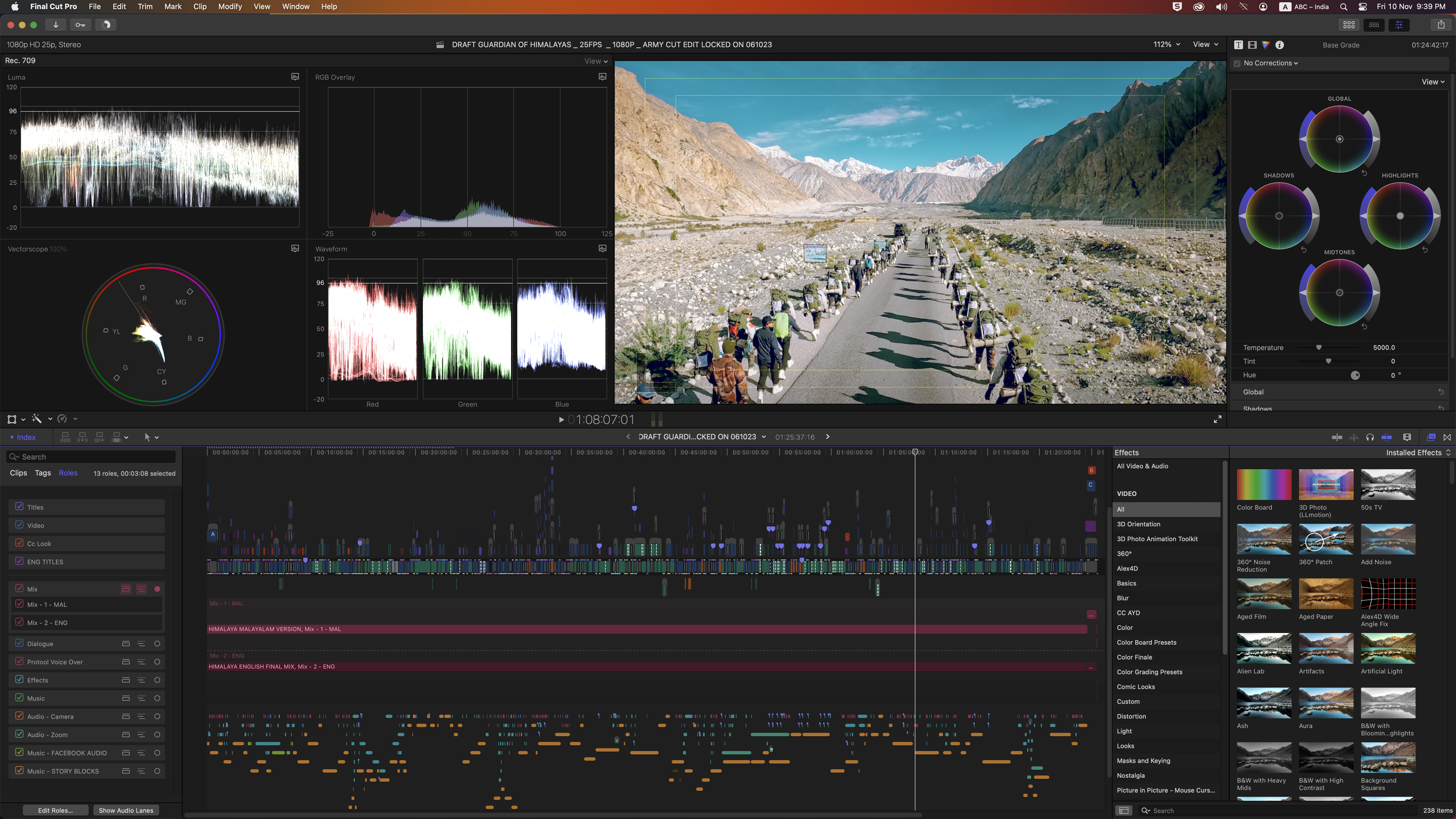Color Grading started on 9th November 2023. It was complex due to different cameras and extreme terrain. The built-in color tools helped me to complete my work easily and the Power Full Final Cut Pro handled all things smoothly. I had 4 layers of colour filters in each clip and completed the grading process in 3 days. After grading, we used fcpx title presets for name supers and other labelling.
