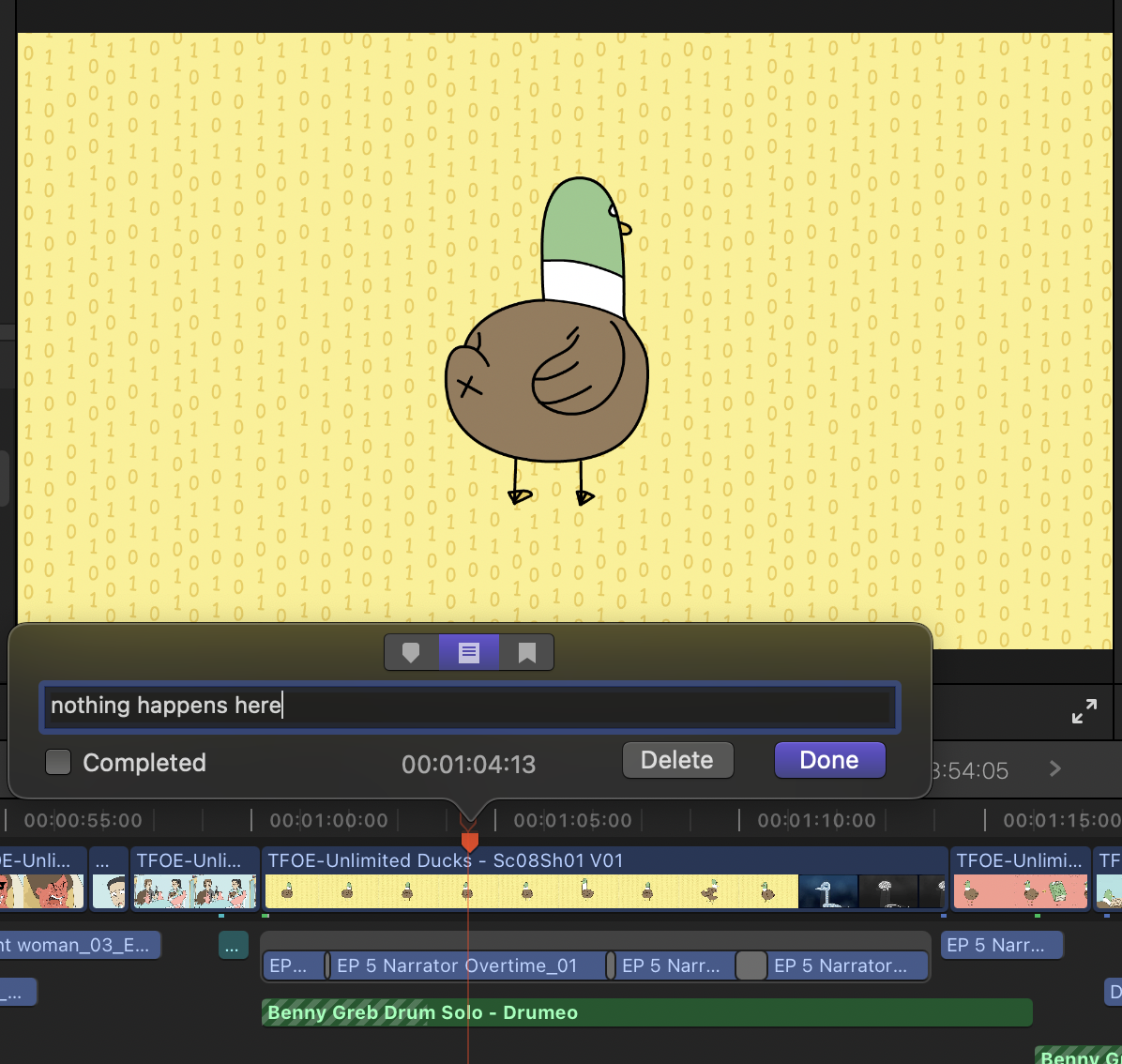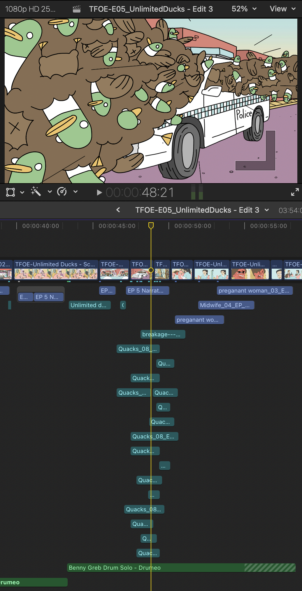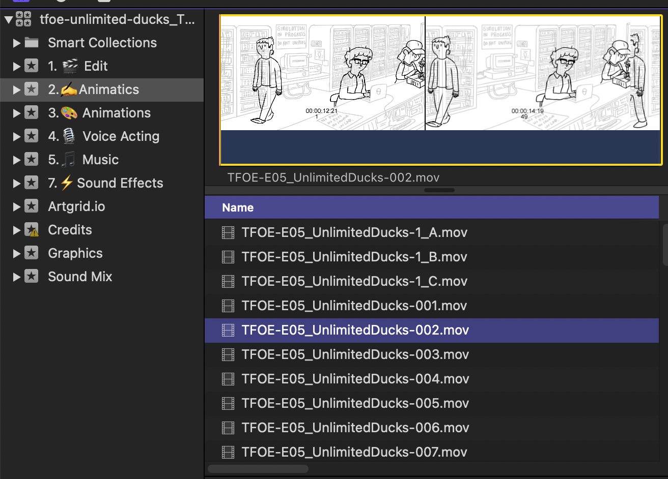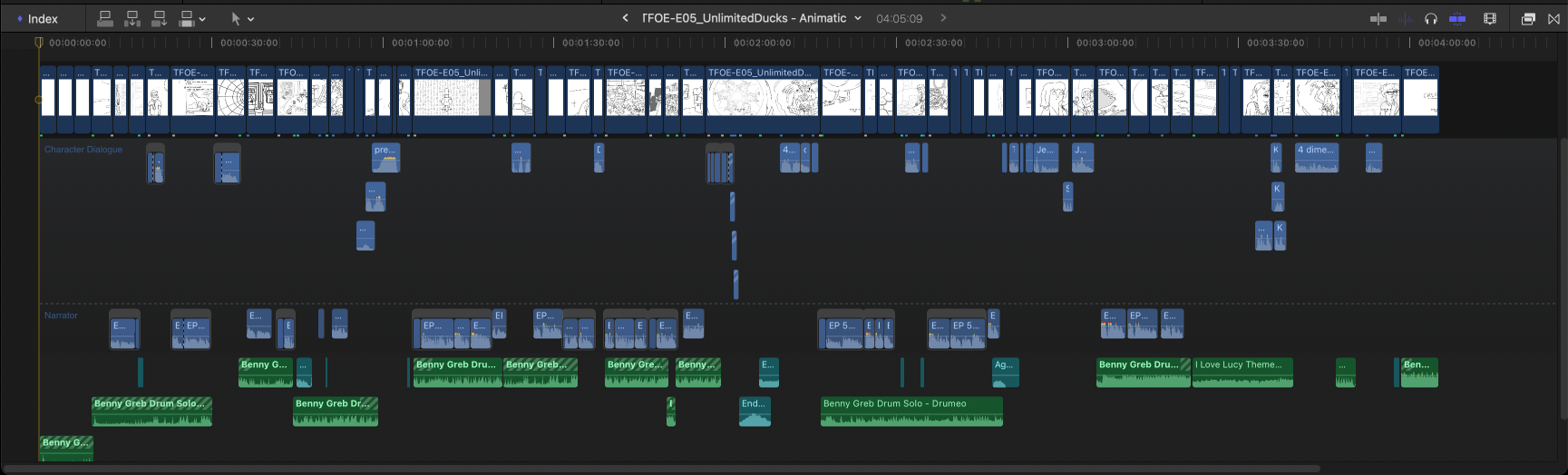 With the first twelve shots that I received, I exported ProRes 4444 from Adobe Animate and then imported them into keyword collections, that were organised by date, in the Animations Event I’d created. This became my process, eventually welcoming all 51 shots into my timeline for episode one. As mentioned, I used the .xml to help me lineup shots for timing, and would export weekly WIP edits for Mike and the producers to review.