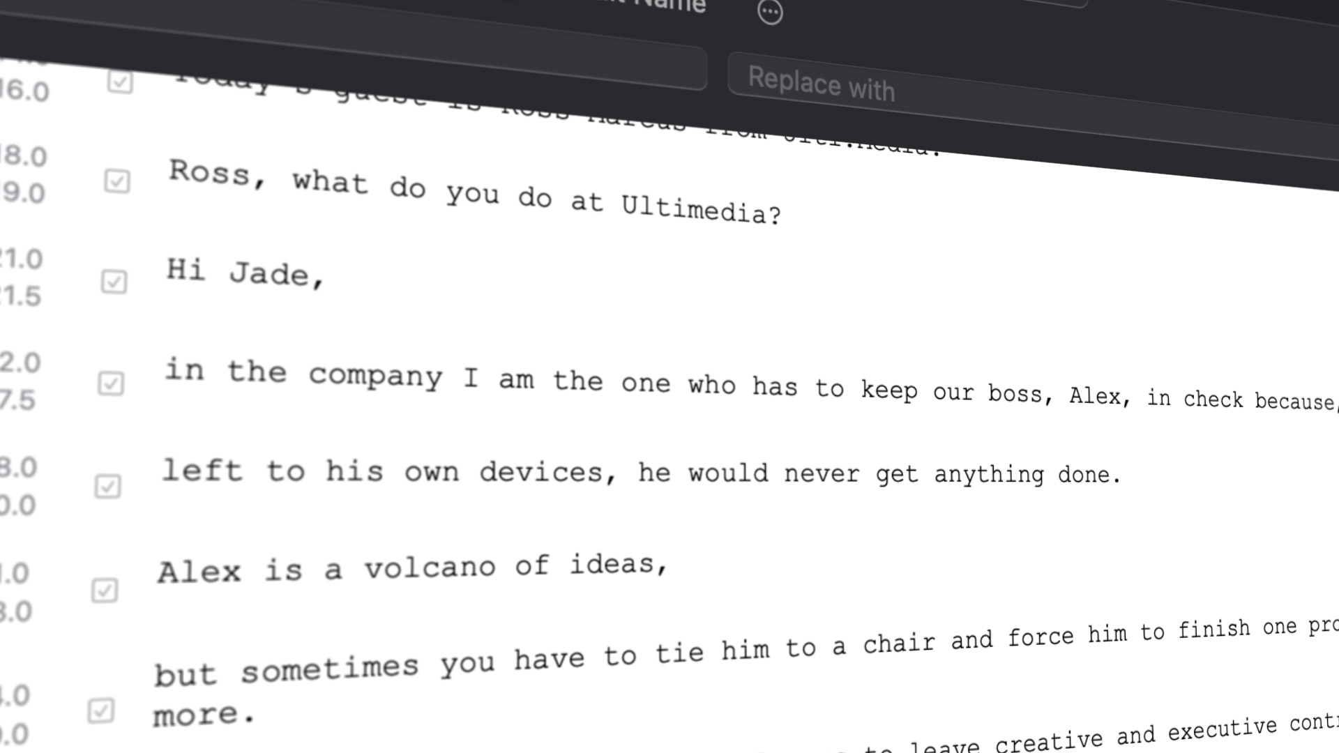 I always thought that when doing a speech review, physically, the people in charge have in front of them a sheet, printed in Courier font, with all the features of the script. For this very reason I wanted the words and sentences to be written in this same style, not so much for skeuomorphism, but because it is still the most effective and efficient method of reading the text while listening to the related audio.