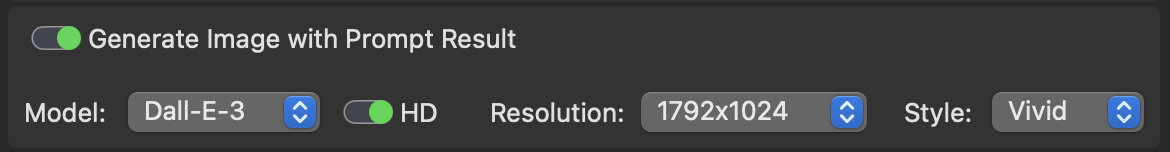 You can choose the model, DALL-E 2 or DALL-E 3 (DALL-E 2 is absolutely unqualifiable in quality, I think they only keep it on because there are some applications that use it). For DALL-E 3 you can choose to generate a square or 16:9 image, either horizontally or vertically.