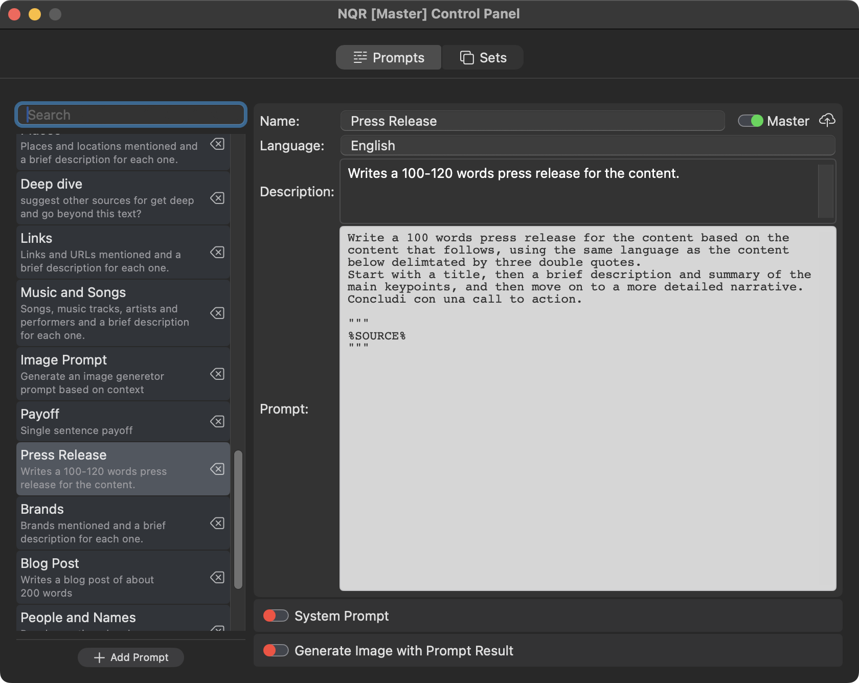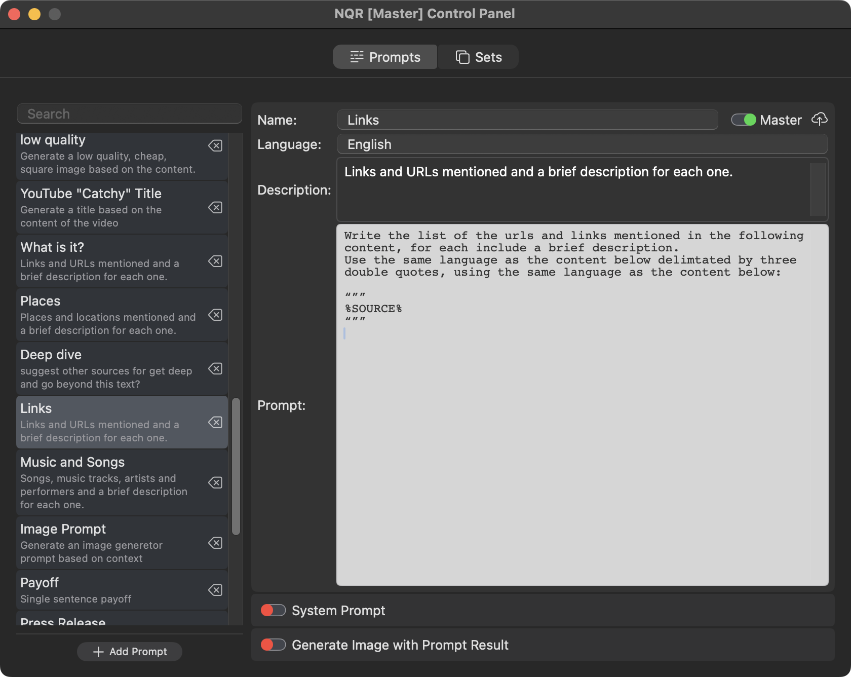 Perhaps this thing I wrote may sound a bit ... “pompous,” or “ self-praising,” however, I tried very hard to think from the end user's point of view: the organization of prompts into sets allows you to generate an immense amount of content by simply doing two clicks by first selecting the set and then running the analysis.