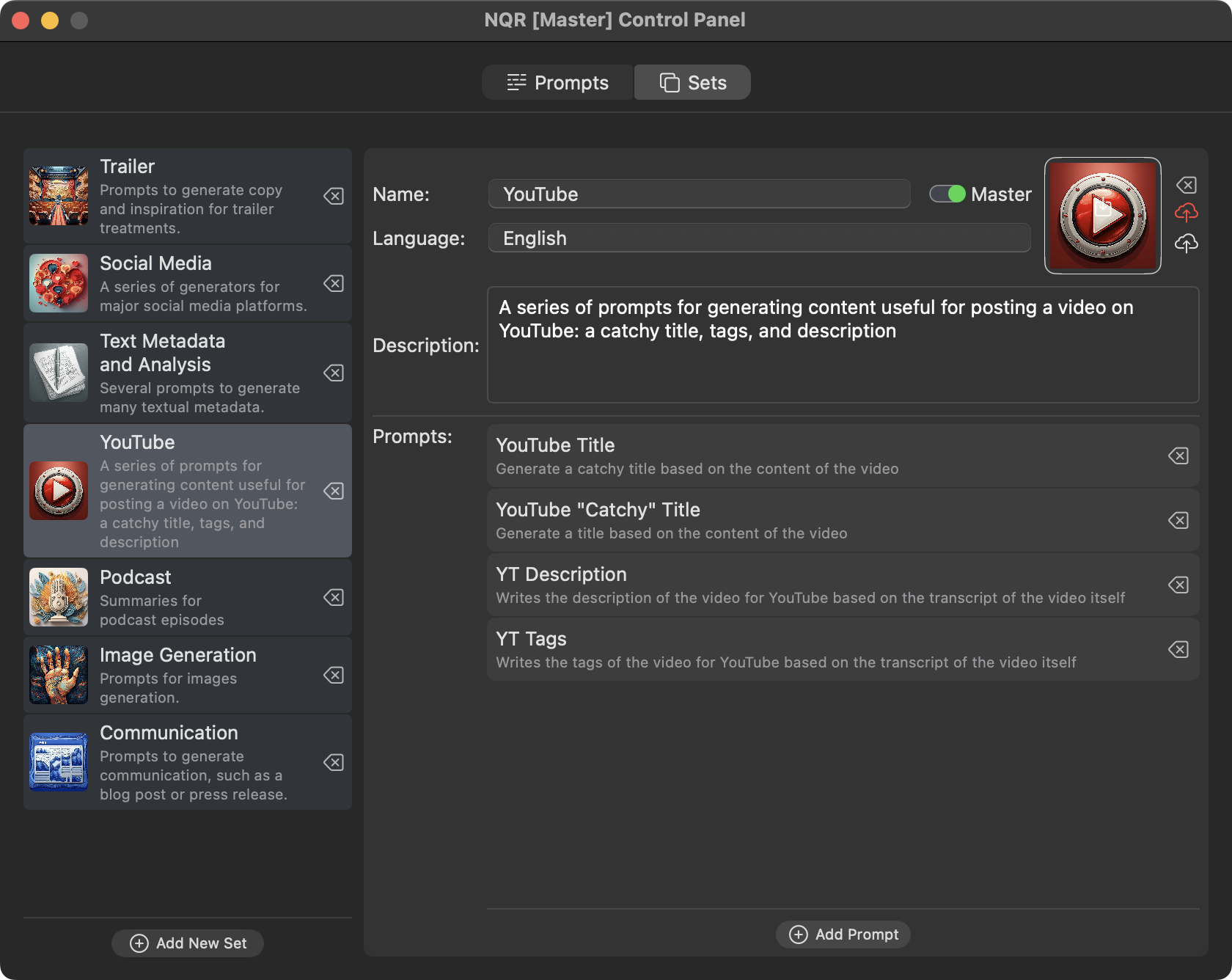 And to make the application of these prompts usable and fast, I have developed a grouping system that allows you to organize different prompts within sets, there is a set for YouTube, a set for social media, a set for meta data, ... In this way a user can apply and execute different prompts just by selecting the single set.