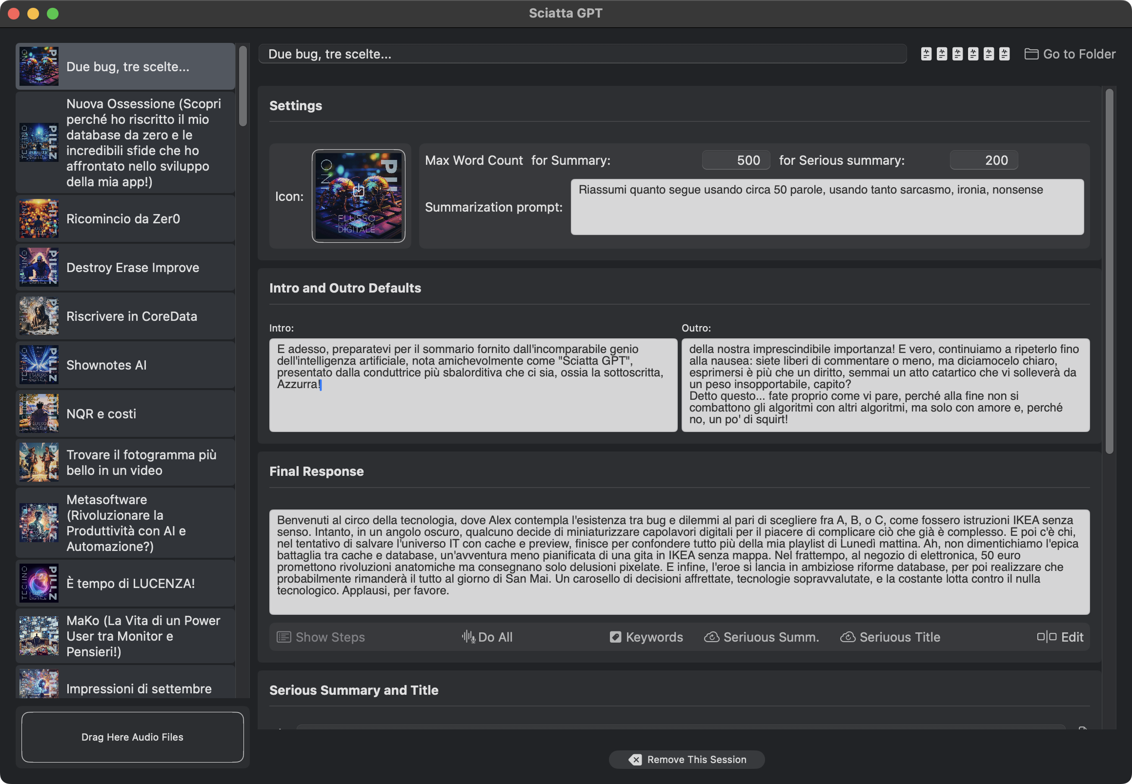 For the last two years I've been making use of this internal tool I wrote myself, called SciattaGPT (the literal translation would be “dull, sloppy, scrappy GPT”), which I use to create the episode summary and title suggestion, always making use of ChatGPT, first with the 3.5 model, then with GPT-4 and now with GPT-4o-mini.