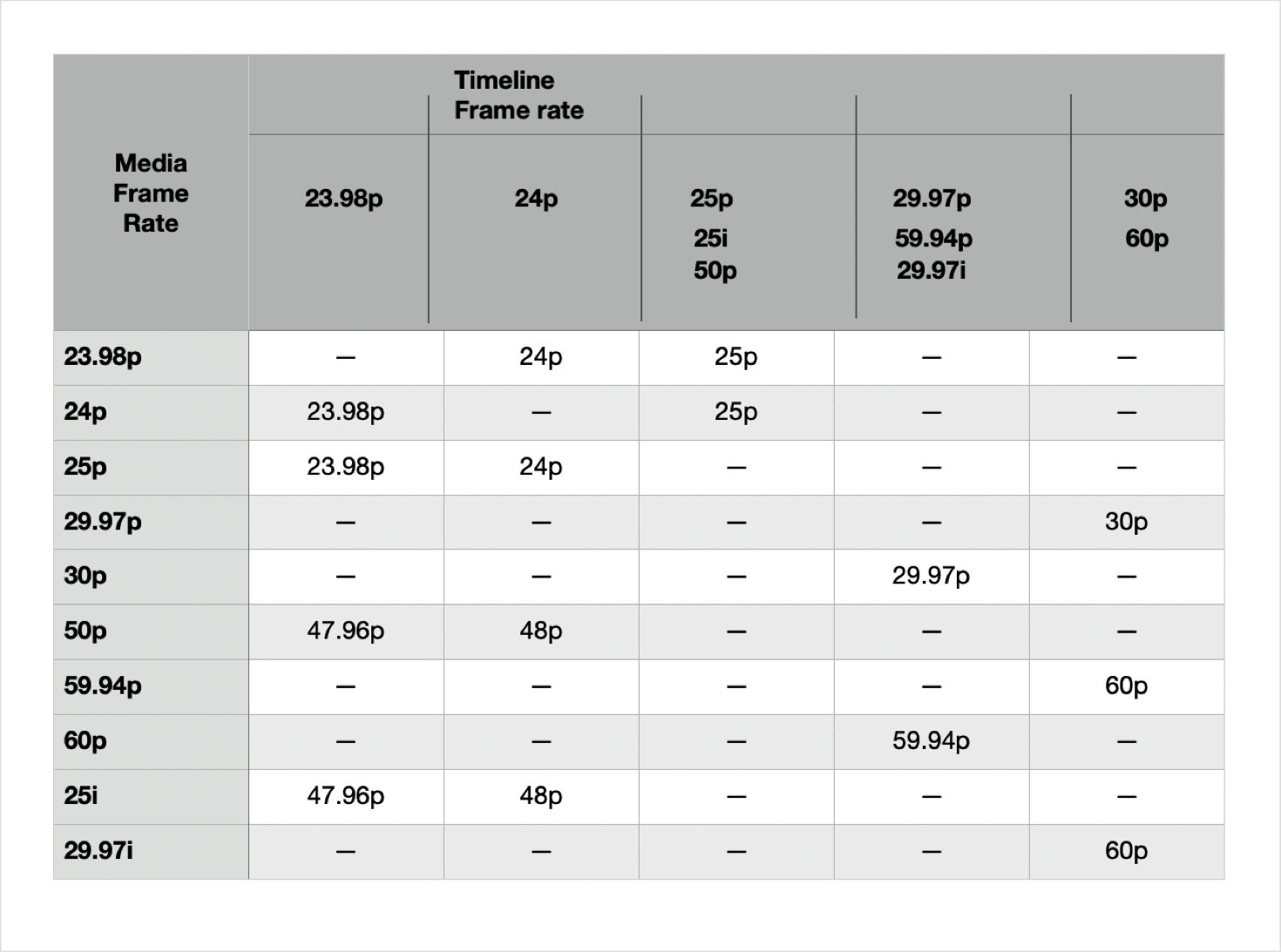 When your media has specific combinations of timeline frame rate and media frame rate, Final Cut Pro automatically applies rate conforming by converting the media frame rate to match the timeline frame rate, as shown in the Final Cut Pro rate conforming chart below. As a result, Final Cut Pro also adjusts the duration. When this occurs, the Rate Conform section appears in Final Cut Pro Video Inspector. Use the conform-rate element to indicate rate conforming.