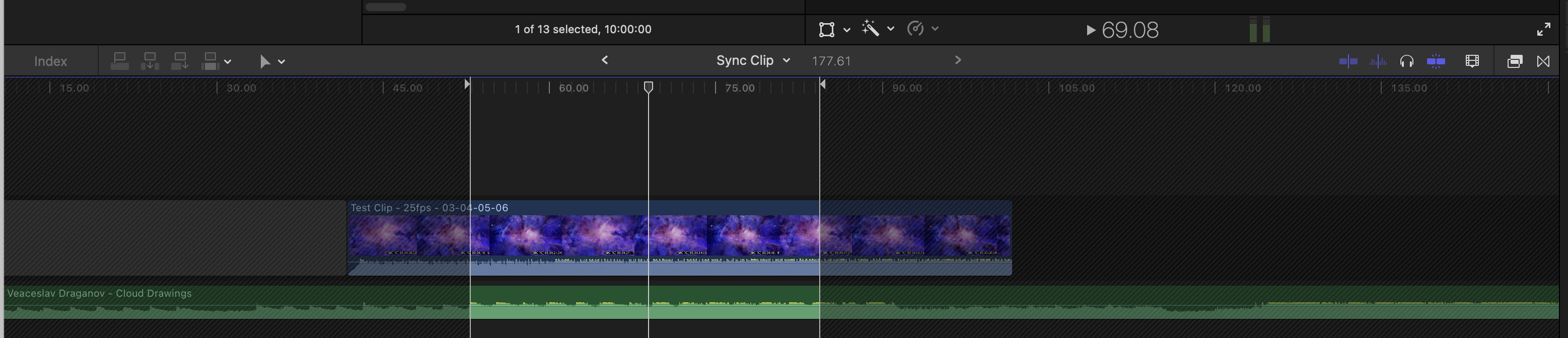 <asset-clip ref="r2" offset="0s" name="Test Clip - 25fps - 03-04-05-06" start="27613100/2500s" duration="60s" tcFormat="NDF" audioRole="dialogue"/>