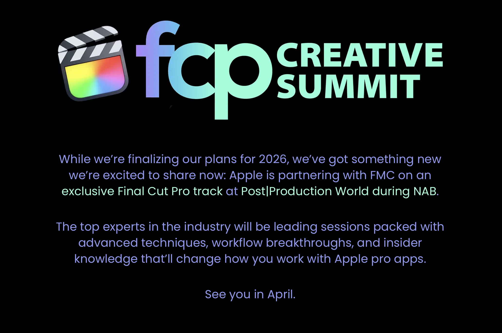 So far there's no news on the Final Cut Pro Creative Summit for 2026.