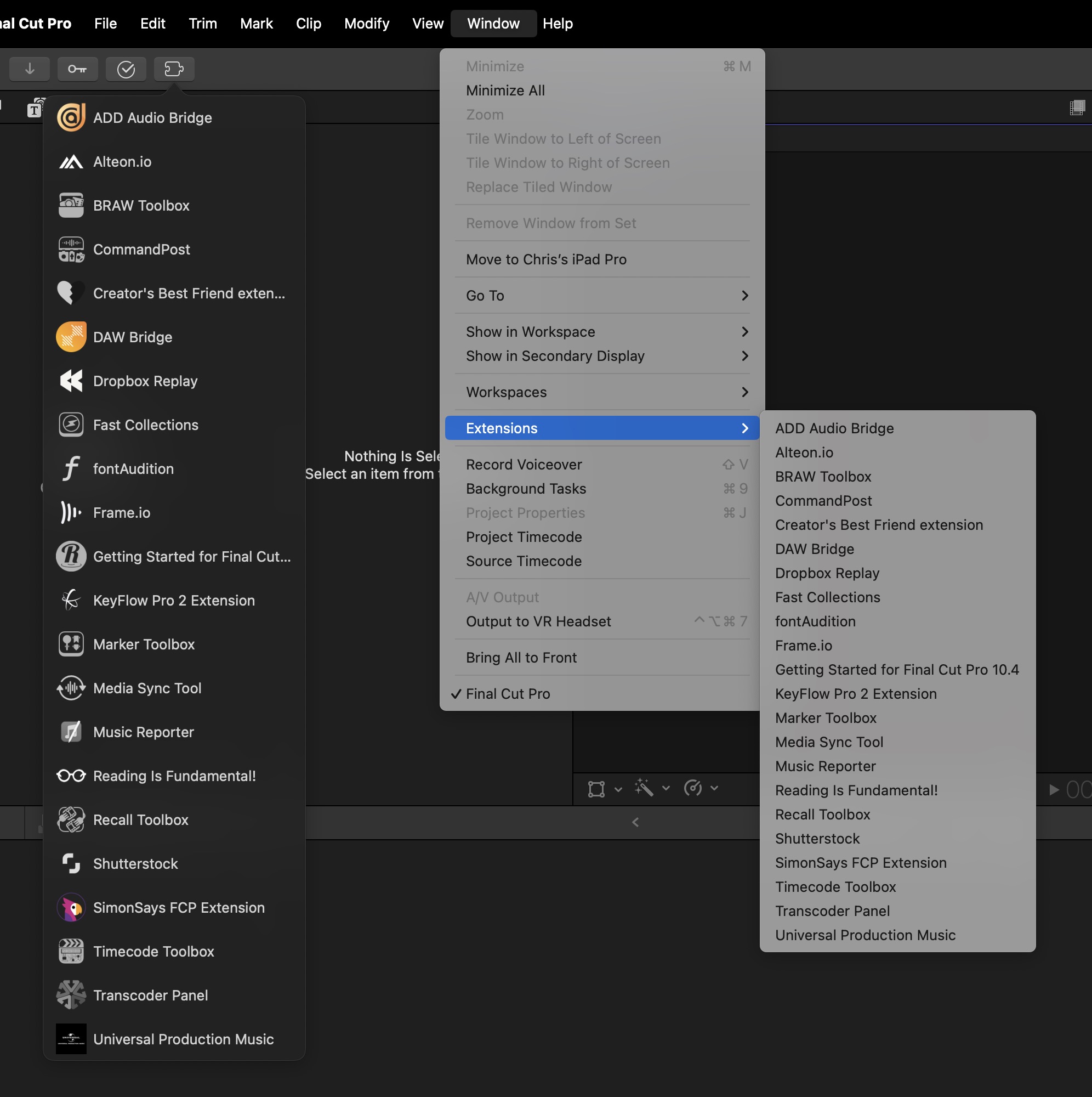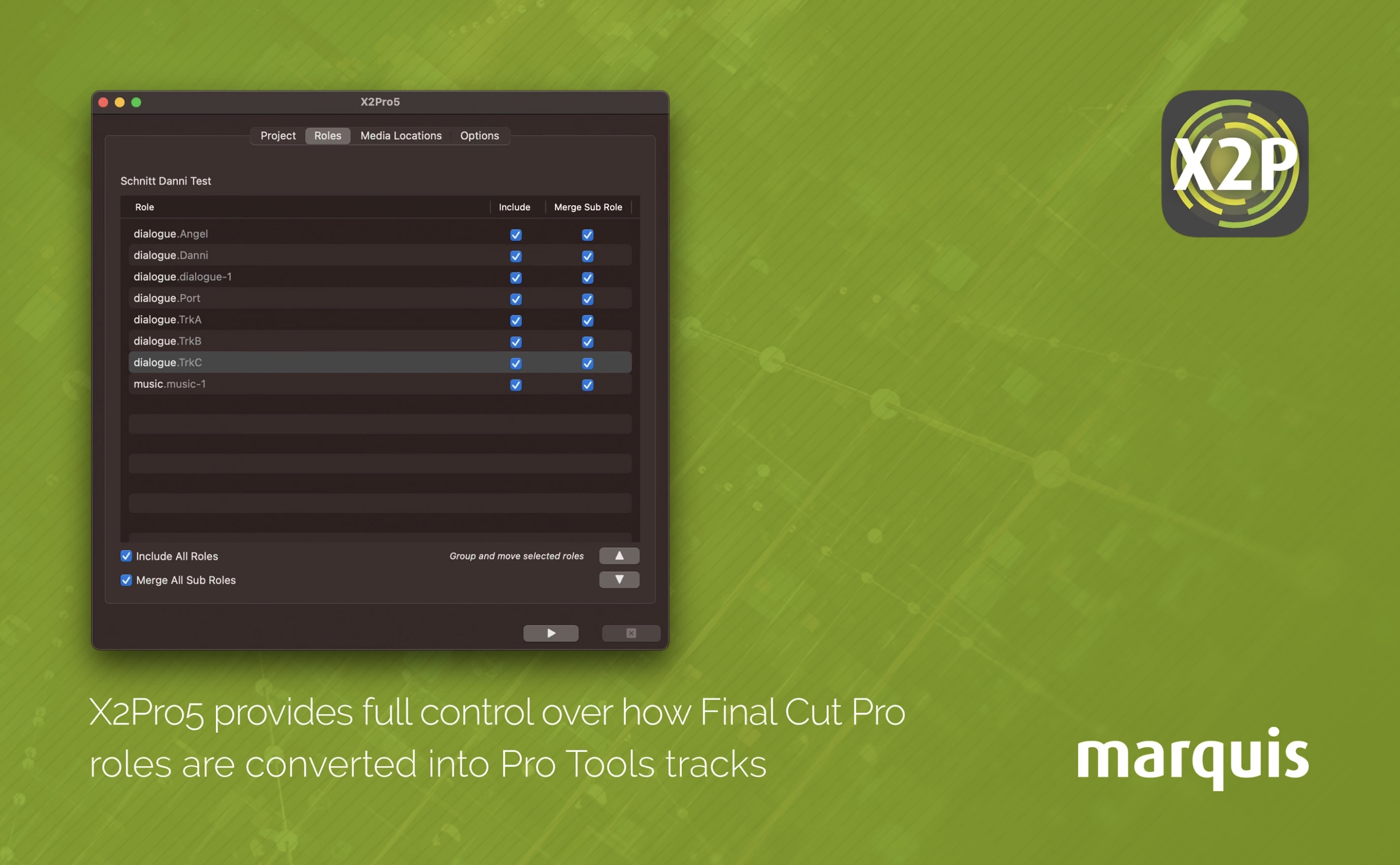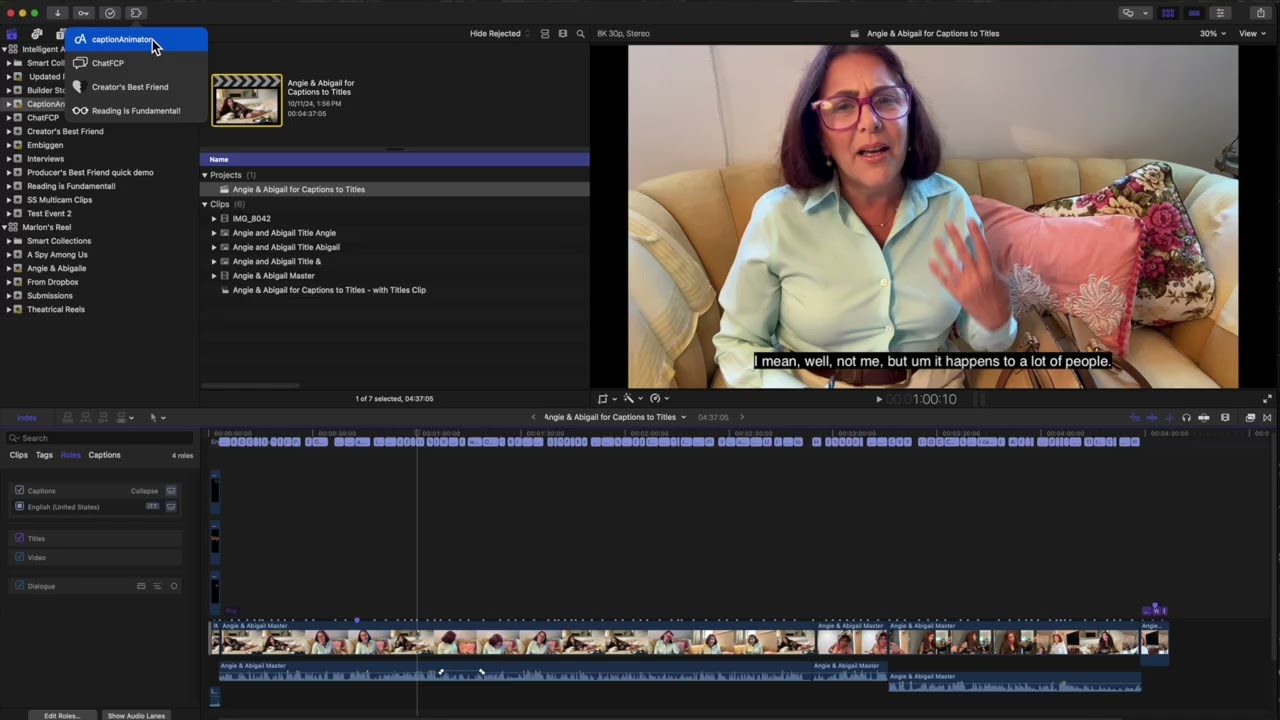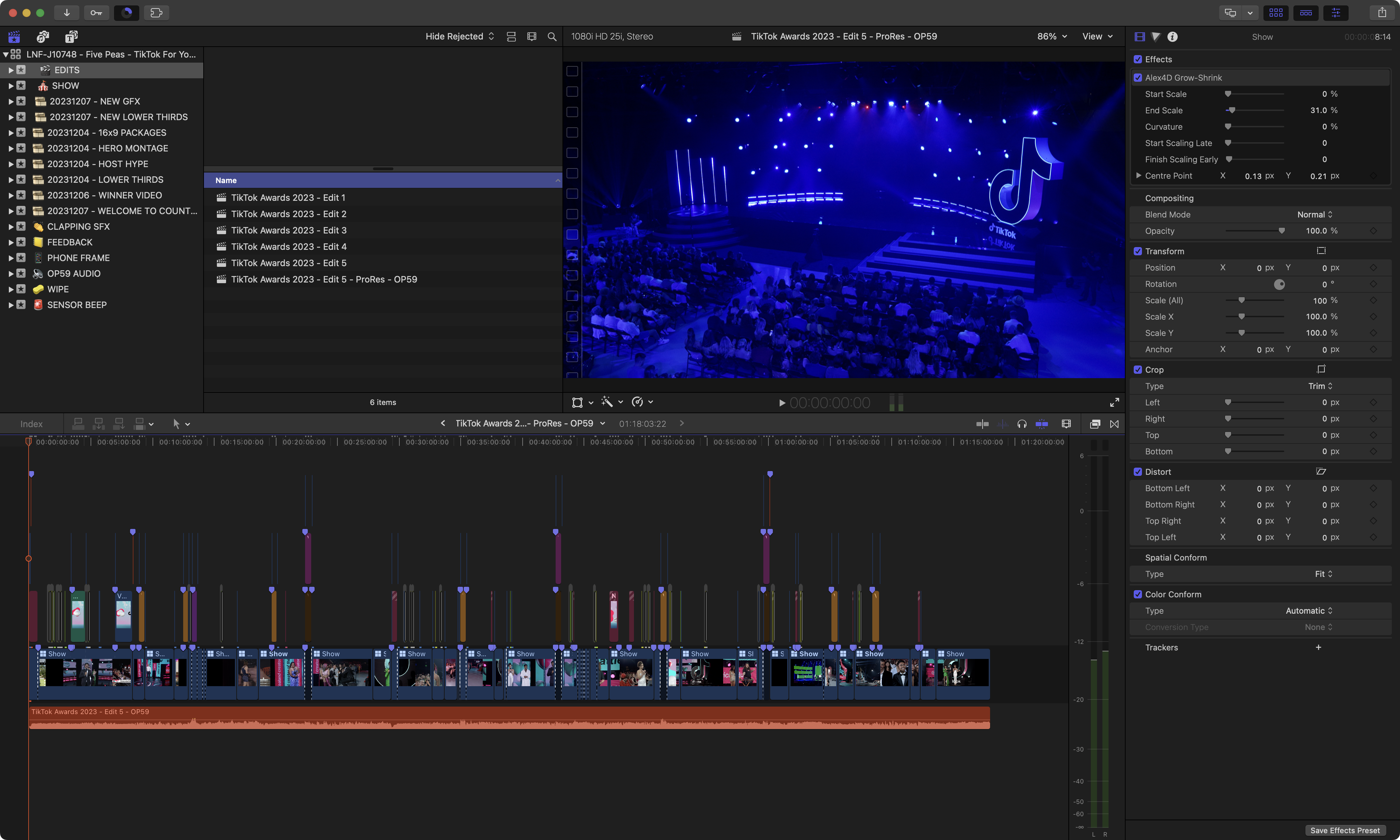 FCPXMLs were sent to DaVinci Resolve for colour grading and X2Pro was used to send AAFs to ProTools for mixing. The sound designer was very impressed with the neatness of the timeline.