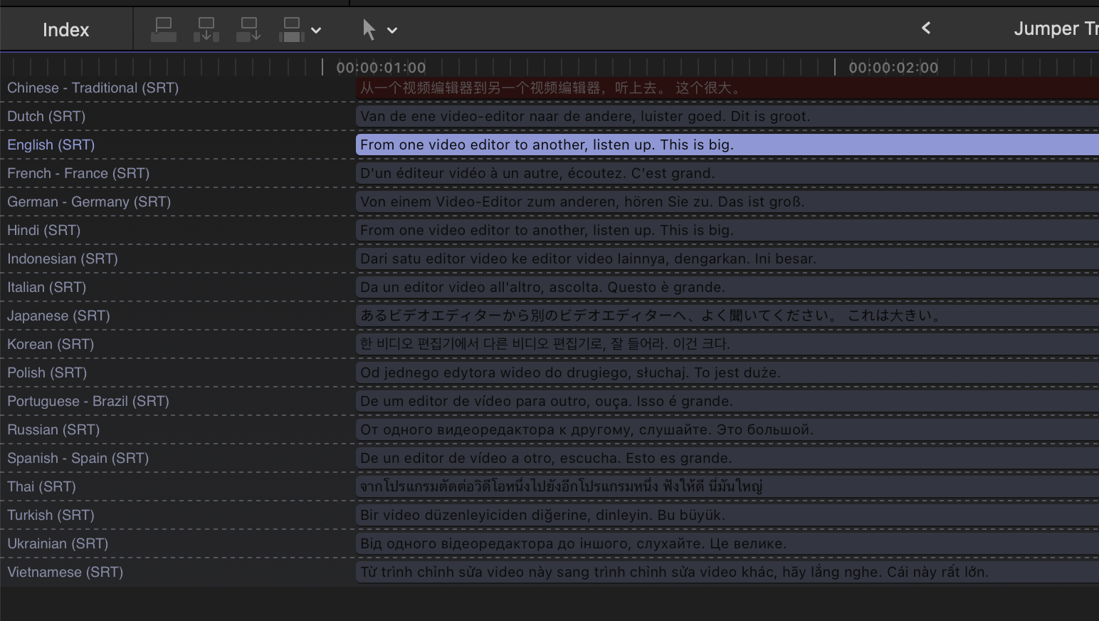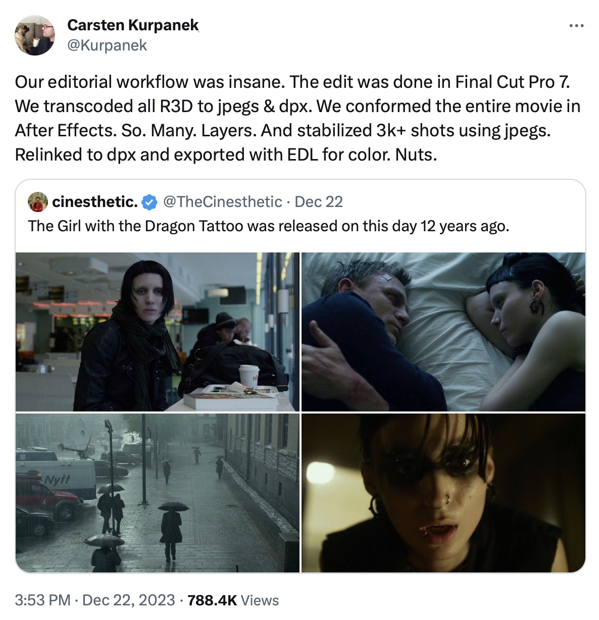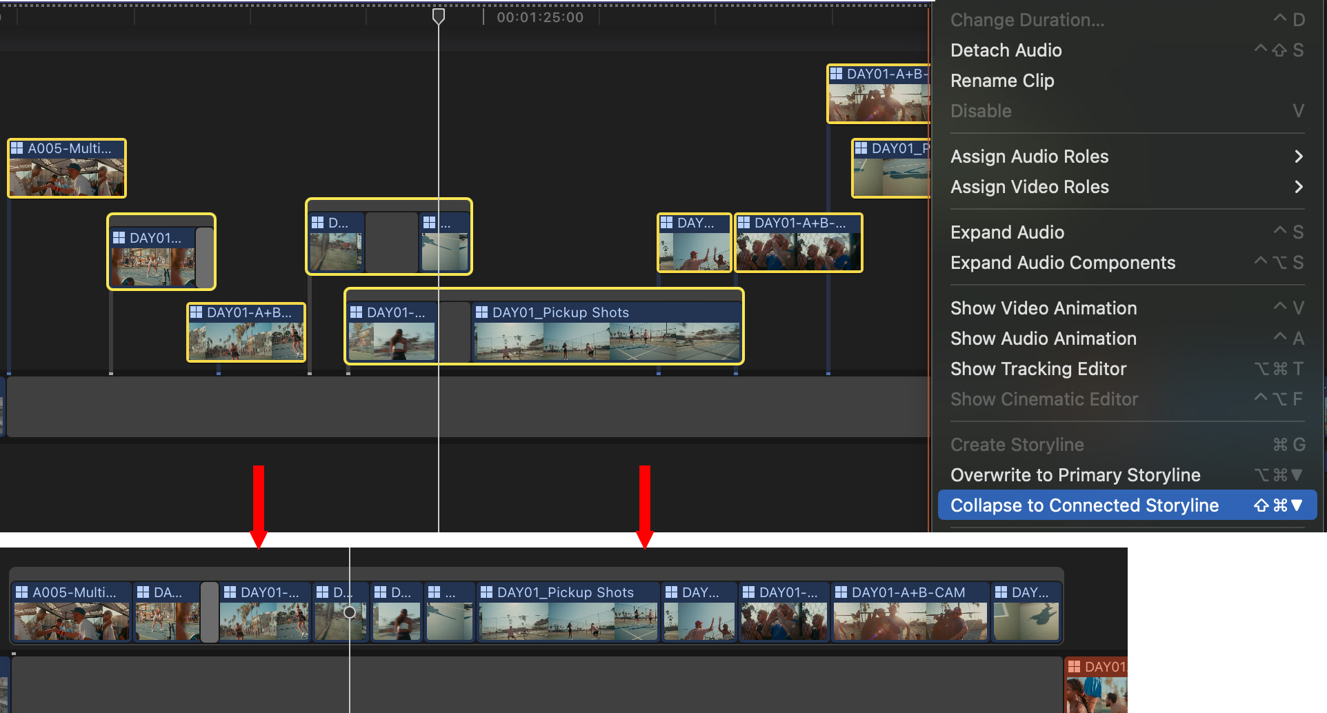 FCPXMLs were sent to DaVinci Resolve for colour grading and X2Pro was used to send AAFs to ProTools for mixing. The sound designer was very impressed with the neatness of the timeline.